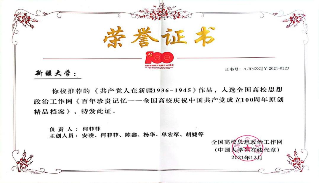 《共产党人在新疆1936-1945》成功入选全国高校思想政治工作网“百年珍贵记忆——全国高校庆祝中国共产党成立100周年原创精品档案”