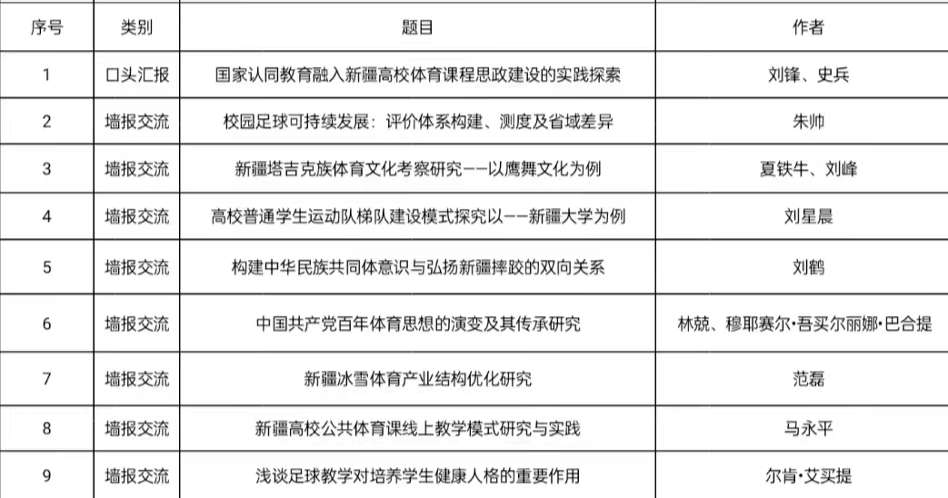 近日,由中国教育学会、中国高等教育学学会主办,西华大学承办的第十届中国学校体育科学大会对录用论文进行了公示,体育教学研究部共录用论文9篇:专题口头汇报1篇、墙报交流8篇;其中,墙报交流录用篇数位居全国第33位;自治区高校(含体育学院)并列第二位、公共体育教学部第一位。