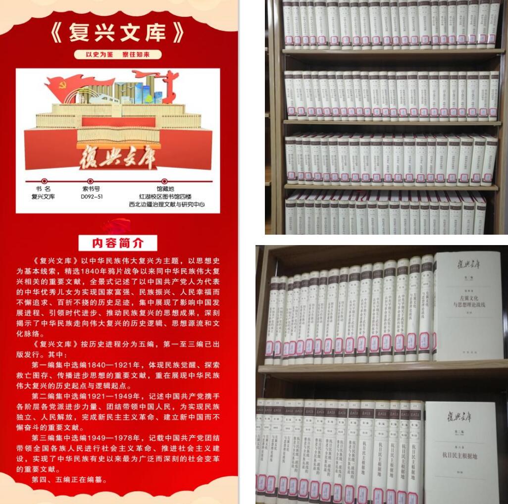 近日,米兰milan官方网站图书馆完成大型历史文献丛书《复兴文库》第一至三编的采购、编目和加工,已在红湖校区图书馆四楼西北边疆治理文献与研究中心专题书架展出,为全校师生使用这批具有重要历史价值和时代意义的珍贵文献提供便利。