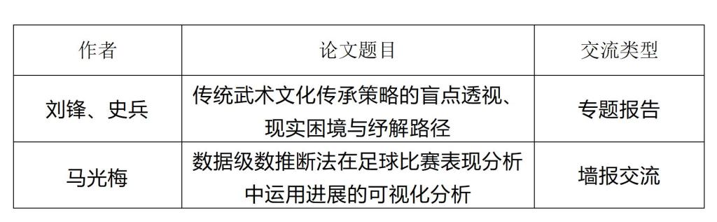刘锋副教授发表《传统武术文化传承策略的盲点透视、现实困境与纾解路径》专题报告。马光梅老师发表《数据级数推断法在足球比赛表现分析中运用进展的可视化分析》墙报交流。