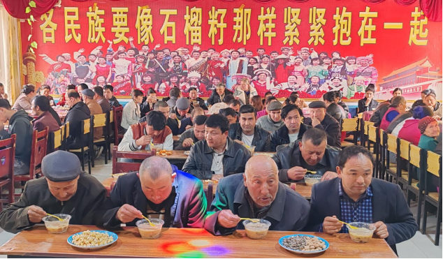 当天,后厨热气腾腾,村民们一大早就自发前来帮忙,熬制了近百公斤由大米、小麦、红豆、红枣、羊肉等食材组成的美味诺鲁孜粥饭,整个活动大厅弥漫着诱人的香味。在等待美食出锅的过程中,村民们欢聚一堂,吃着糖果,聊着家常,分享着各家各户的趣事与近况,现场洋溢着欢乐的笑声。当诺鲁孜粥饭出锅后,年轻人们将一碗碗热气腾腾的粥饭端给在座的老人和驻村工作队员享用。享用完美食后,大家不约而同地跳起了欢快的麦西莱甫,驻村工作队员与辖区各族群众一起唱歌跳舞,尽情表达着对美好生活的向往和对春天到来的期盼。