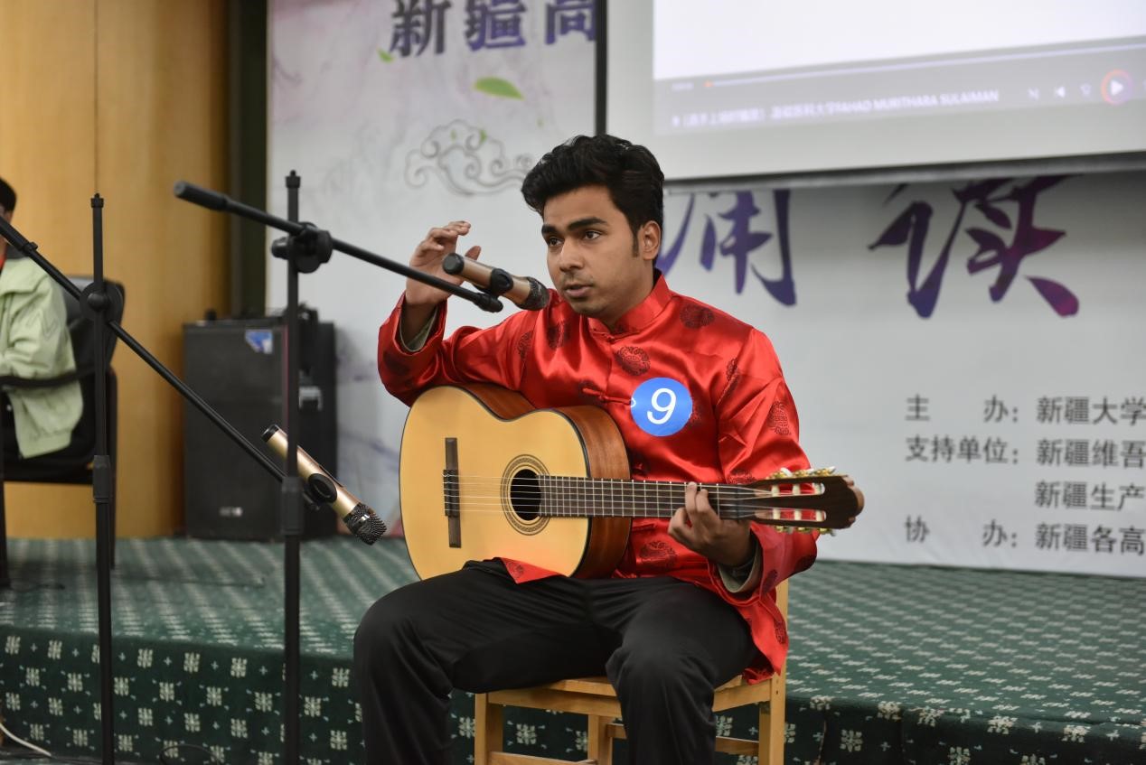 9号选手国际学生FAHAD MURITHARA SULAIMAN给大家的印象尤其特别。他首先诵读了李白的《将进酒》,然后又一边弹吉他一边吟诵《将进酒》,虽然诵读时的中文不是很标准,但吟诵的声调准确且富于激情,他的精彩表演赢得台下观众热烈的掌声。