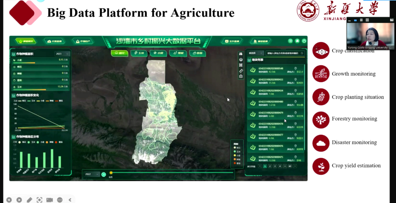 报告结束后,钱育蓉院长还耐心解答了与会人员的提问,并分享了更多深入的见解和观点。在面对新疆智慧农业面临的主要挑战这个问题时,钱育蓉院长认为在未来可以有更多的大模型可以被应用于智慧农业,人工智能技术可以更多赋能这个领域,并强调了智慧农业和传统农业的主要区别,分享了自己对智慧农业未来发展的更多想法。最后,就国际合作方面,钱育蓉院长积极欢迎哈萨克斯坦的学者和学生到米兰milan官方网站访问学习和合作。与会人员对钱育蓉院长的演讲给予了高度评价,认为她的报告不仅展现了遥感与计算机视觉技术的巨大潜力,也为推动国际学术交流与合作提供了新的思路。